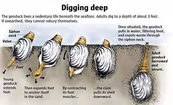象拔蚌的英文俗名叫Geoduck,有“深挖”的含义,顾名思义它们喜欢栖息于泥沙质浅海海底或潮间带,能将自己埋藏于一米深的泥沙中,靠伸出粗壮的虹吸管与外界进行物质交换。象拔蚌于幼年时利用出入水管对侧的足将自己逐渐埋入泥沙内固定,因为象拔蚌的足高度退化,相对于成体的比例较小,一但“扎根”,成年后则无法再次“挪窝”。