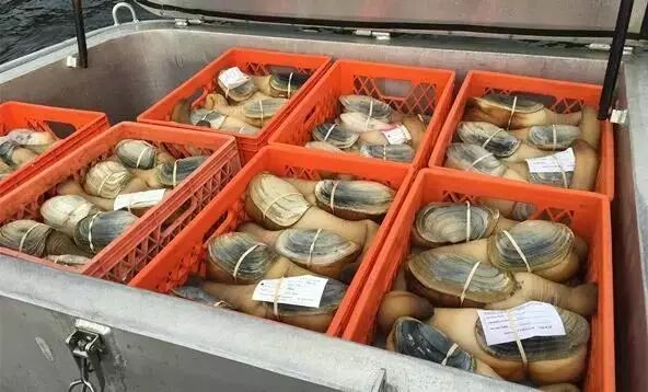 潜水员在水下捕获象拔蚌后,都会放入随身的网兜中,由于象拔蚌的蚌壳很薄,为了防止起网时下部的象拔蚌被上部的压碎,每次下海捕捞象拔蚌的数量都是有限的,这更增加了捕捞成本。起网后,船员们会小心翼翼的从袋子中将象拔蚌取出,每只象拔蚌的壳都会被绑上一条皮筋,这样既方便运输也利于保鲜。