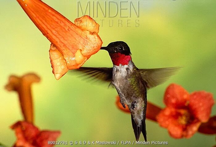 如果熟悉蜂鸟这种生物,你或许能理解其中的原因。图为红喉北蜂鸟吸食厚萼凌霄的花蜜。图片:S and D and K Maslowski / Minden Pictures