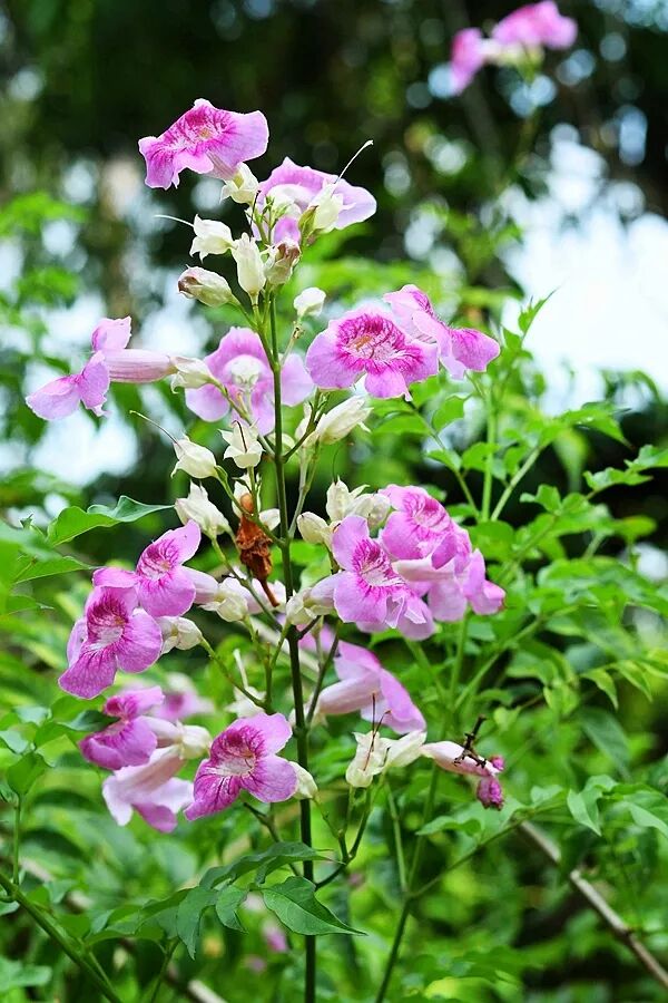 在盛产高颜值植物的紫葳科大家族中,除了凌霄和厚萼凌霄,还有一些植物名字中带“凌霄”,但不属于凌霄属。它们就是凌霄的亲戚:非洲凌霄属的非洲凌霄(Podranea ricasoliana),粉花凌霄属的粉花凌霄(Pandorea jasminoides)以及硬骨凌霄属的硬骨凌霄(Tecoma capensis)。