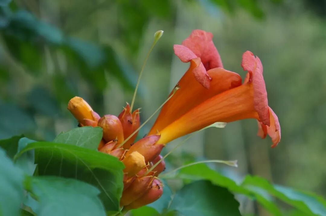 青翠欲滴、橘红似火的凌霄。图片:pixabay