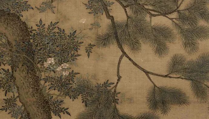 宋·赵佶《听琴图》轴局部。画中的凌霄攀援于青松之上,临风盛放,颇有苏词的意趣。图片:故宫博物院