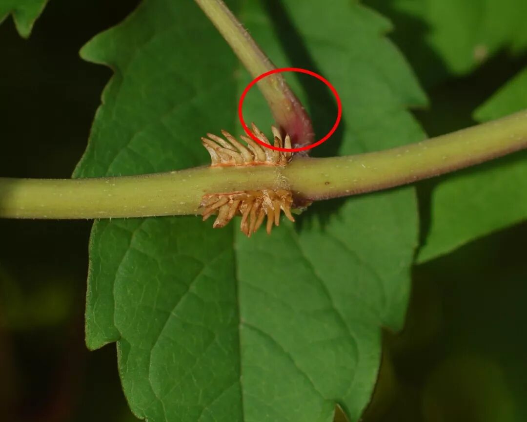 厚萼凌霄叶柄基部的花外蜜腺。图片:climbers.lsa.umich.edu