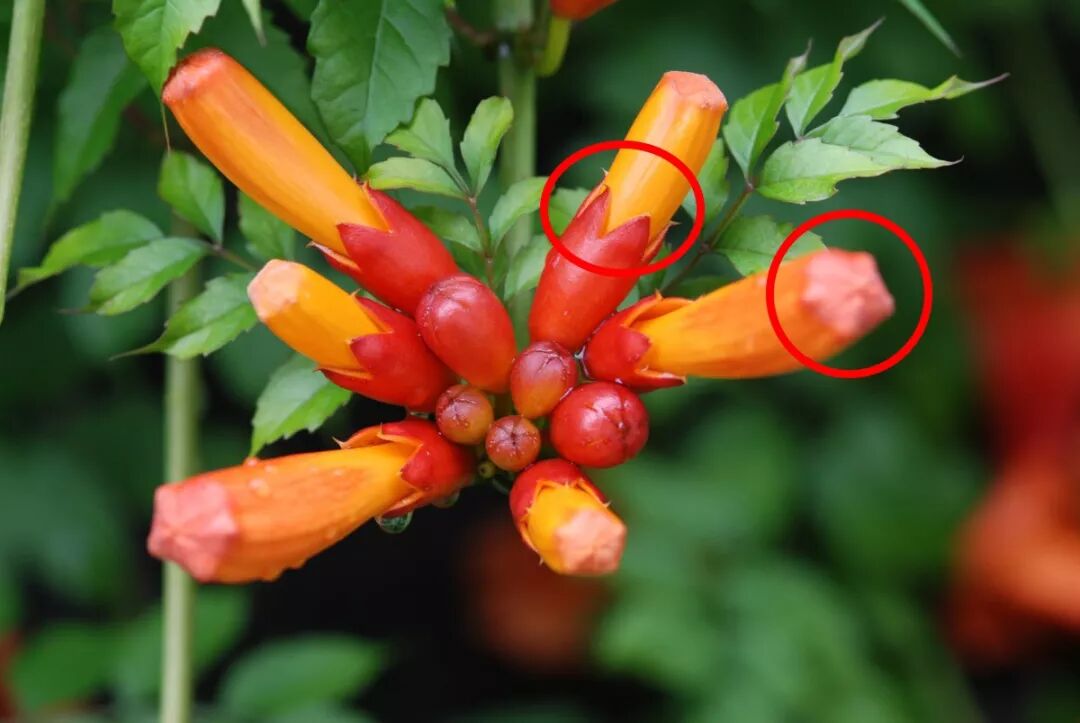 对比凌霄和厚萼凌霄的花冠,我们会发现凌霄的花冠开口大、花冠筒短粗,适合蜂类传粉;而厚萼凌霄的的花冠开口小、花冠筒细长,它的性状十分挑剔传粉者——只有蜂鸟那般细长的喙和舌头,才能轻松地取食到花蜜。然而蜂鸟只生活在美洲,这就是引种的厚萼凌霄在自然条件下难以结果的原因之一。