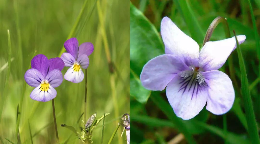 三色堇(左)与早开堇菜(右)。图片:Jörg Hempel / wikimedia;growildnursery.co.uk