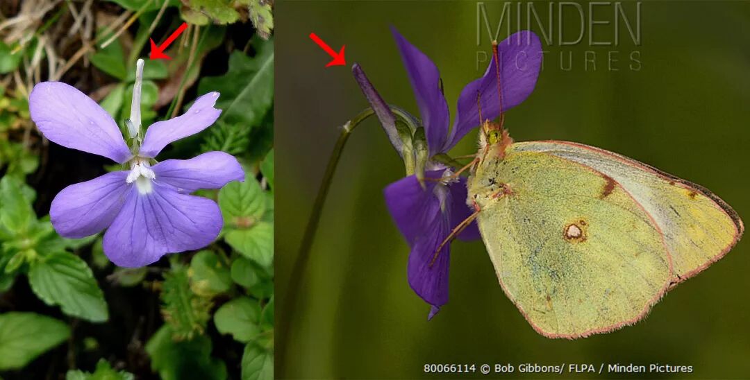 箭头所示即为角堇的距。图片:Isidre blanc / wikimedia;Bob Gibbons / FLPA / mindenpictures