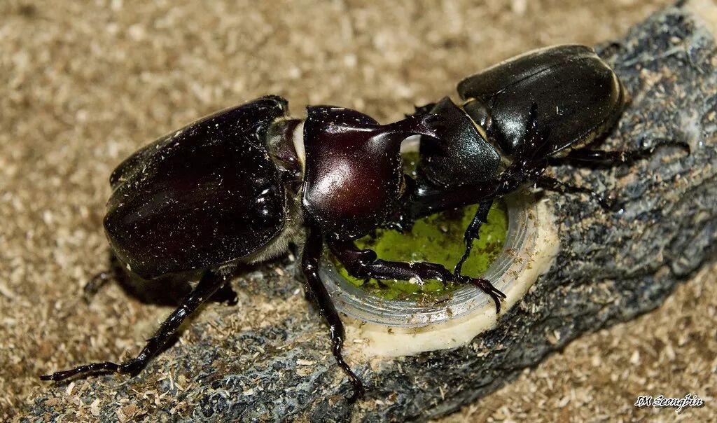 双叉犀金龟发现树汁以后,会用像梳子一样的多毛的口器舔舐树汁。一同前来赴宴的还有自带老虎钳的锹甲和圆咕隆咚的花金龟,有时还会有身穿彩衣的蝴蝶来凑热闹。