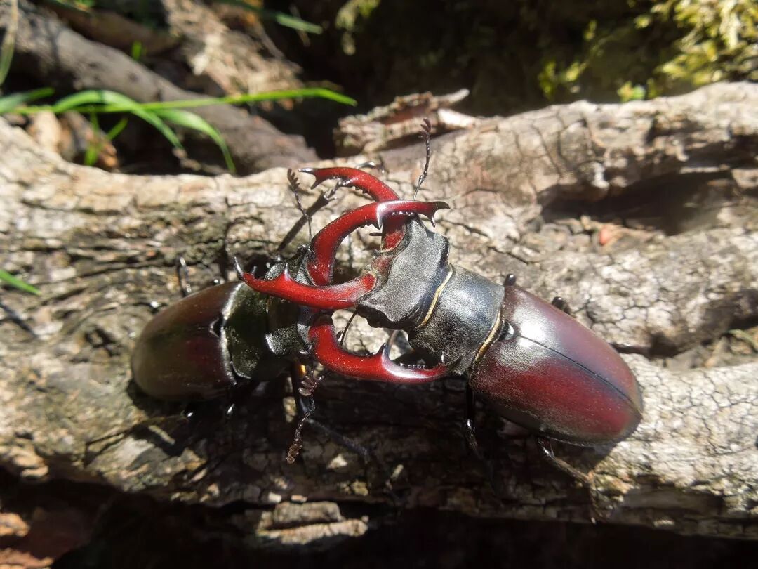锹甲的打架方式是用老虎钳夹住对方,然后往一侧掰;而双叉犀金龟的打架方式则是用角把对方掀翻。图为欧洲深山锹指名亚种(Lucanus cervus cervus)图片:Bugman95 / wikimedia