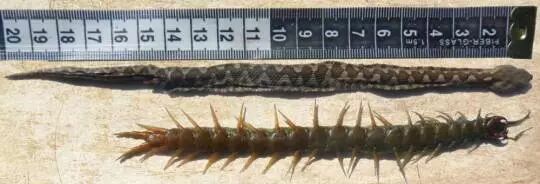 沙蝰和蜈蚣这一对欢喜冤家的体型对比。图片:Dragan Arsovski et al. (2014) Ecologica Montenegrina 1(1):6-8.