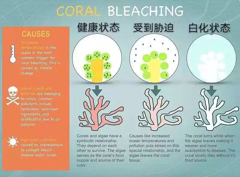 珊瑚礁可以为大量生物提供食物和栖息地,但是当它们面临污染、过度捕捞等人为威胁,以及气候变化时则表现的而很脆弱。当海水温度过高时,会导致珊瑚驱逐与其共生的藻类,这一现象称为“漂白”或“白化”。由于珊瑚的生存依赖这些藻类供能,许多珊瑚最终因此死亡。而日益频繁和规模不断扩大的珊瑚礁白化事件正威胁着全球珊瑚礁的未来。