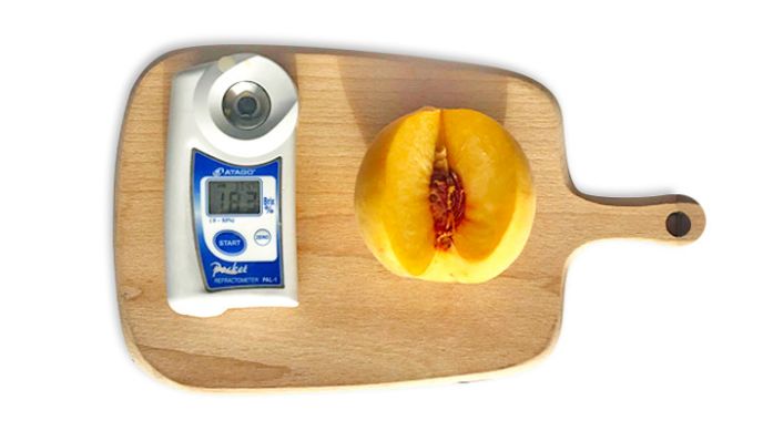 能让这刁钻的舌头说出满意的话,得测测这桃儿的甜度。不测不知道,一测吓一跳,18.3,这属于犯规操作吧。一问果农,这批桃普遍16-18的甜度。很可以,给大佬桃递头,哦不递牙齿。