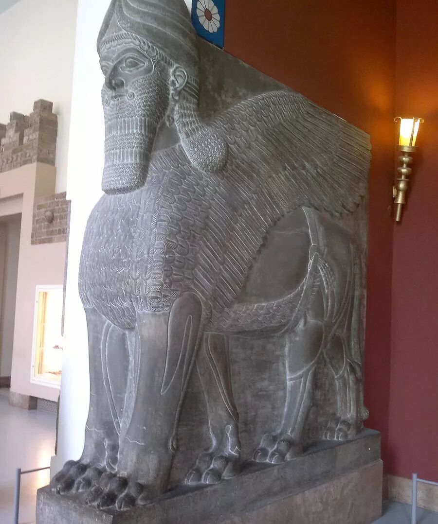 从三千多年前的青铜时代开始,两河流域最早的城市文明中就出现了狮和公牛的图腾。后来的亚述文化中,守护神拉马苏(Lamassu)仍是以带翅膀、人首的公牛和雄狮形象出现,被做成巨大的石雕守卫王宫的入口。亚述帝国的巅峰时期,国王亚述巴尼拔(Ashurbanipal)把自己猎狮的场景刻在了首都尼尼微(Nineveh)的宫殿墙壁上,流传至今。