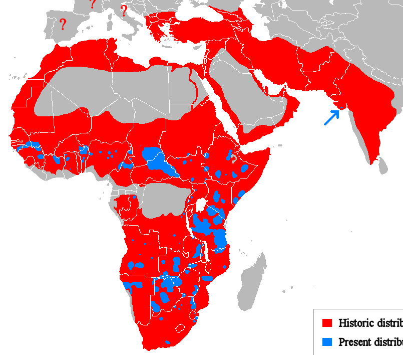 红色为狮的历史分布区,蓝色为如今分布区。图片:Tommyknocker