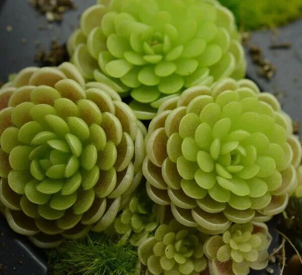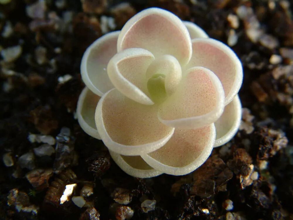 乍一看,爱丝捕虫堇很像拟石莲属的多肉。这不怪大家,因为它们也具有莲座状生长、紧贴地面的叶片。其叶片肥厚多汁,呈倒三角状,边缘微微向中心翻卷成勺状。在昼夜温差大的情况下,叶片会呈现出可爱的粉色,好像是层层堆叠的奶油蛋糕一样,让人不禁想咬一口。
