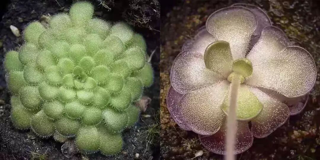圆切捕虫堇P. cyclosecta的冬型叶(左)与夏型叶(右)。图片:Denis Barthel / wikipedia