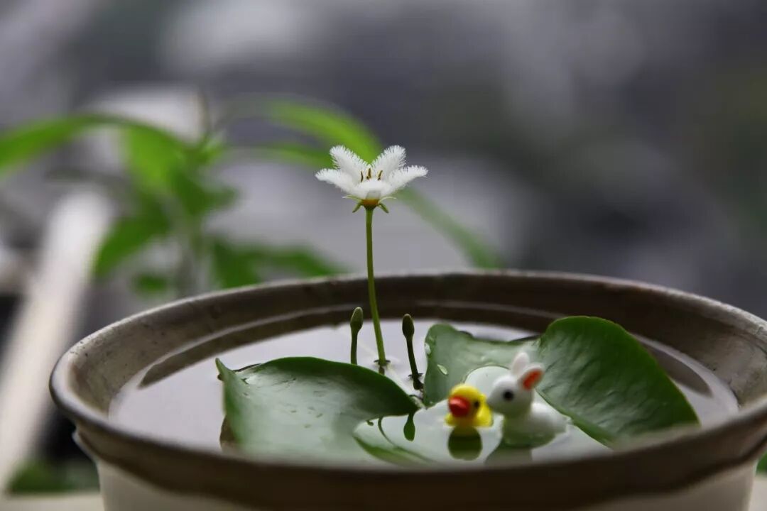 所以这里就各取所需吧!您把“一叶莲”当作鲜切花,一时观赏,也是挺美好的事。但想要不死,想要之后可以继续开花,就最好有水缸,当作水生花卉来栽种了。顺便说,不同的“一叶莲”,对水域的大小、深浅要求不同。金银莲花要大缸,最好是池子,不然像是一米八的壮汉被塞进了婴儿床,憋屈。小莕菜则要求水深最好不超过10厘米,不然不易扎根,像是一米高的小孩儿进了深水区。我栽种最多的是龙骨瓣莕菜和龙潭莕菜,水深10-20厘米就够,水域面积大些,就长得繁茂些。