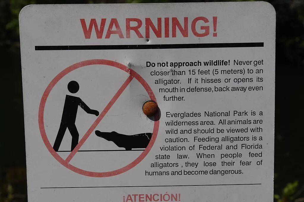 佛罗里达大沼泽地国家公园(Everglades National Park)的警示牌,提醒游客要和短吻鳄保持5米的距离。图片:Kolossos / Wikimedia Commons