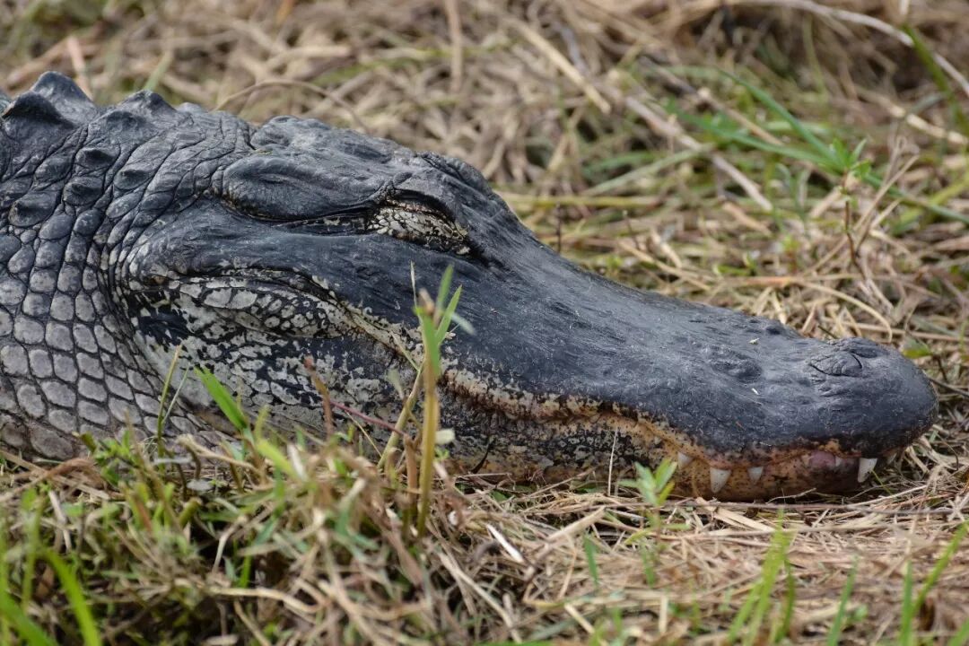 短吻鳄近照,长着一张宽阔的扁嘴,闭着的时候牙齿露出得也不多,看起来比较和善。图片:虫爷ChenZ