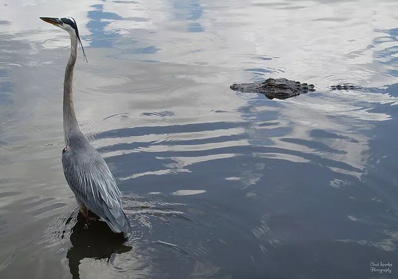 在真正的自然界,捕食者和被捕食者的关系并不是中学生物书上的单箭头。短吻鳄和其他顶级掠食者一样,需要熬过危机四伏的童年,才能成为天不怕地不怕的猛士。短吻鳄宝宝的天敌很多,其中也包括成年短吻鳄菜单上的水鸟。对大蓝鹭(Ardea herodias)这样的大型水鸟来说,年幼的短吻鳄只不过比鱼多了四条腿,见到自然不会放过。