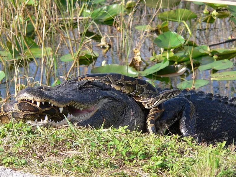 大沼泽地国家公园里,本地物种美国短吻鳄和入侵物种缅甸蟒僵持在一起,缅甸蟒缠住了短吻鳄的脖子,短吻鳄也咬住了蟒蛇。图片:Lori Oberhofer / Wikimedia Commons
