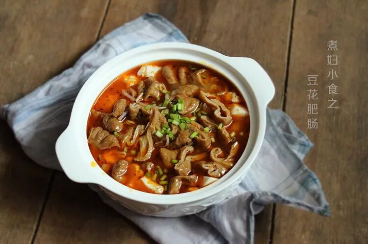还有一道生爆肥肠与此有些相似,不过这道菜的肥肠是直接下锅炒香的,不用经过煸炒,因此还保留着油脂丰厚的软嫩口感。 在之前介绍血旺的时候,提到了一道菜叫肥肠血旺,这里面的血旺起的就是个点缀的作用,主要吃的还是血旺。其实这样把肥肠当成“浇头”的菜还有不少,比如肥肠豆花就是在红烧肥肠的红汤里头又加了大量软嫩的豆花做成,豆花麻辣又香嫩,舀豆花的时候往往带着几粒肥肠,比单纯吃豆花香多了。