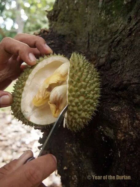 臭榴莲D. graveolens是婆罗洲最受欢迎的榴莲,种加词是“难闻的”的意思,但它其实是榴莲属里气味比较淡的一个种,不知道为什么被安上这么个名字。图片:year of the durian