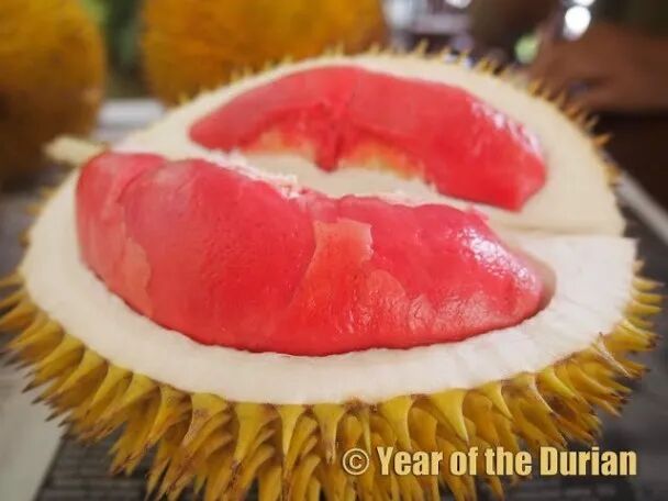 大花榴莲D. grandiflorus,产于婆罗洲的一个种,有深红色的果肉。有个说法是榴莲开什么颜色的花就会有什么颜色的果肉,这是错的,大花榴莲开的是白花。此外这个种的果实也不小,但却是长在枝条上的。图片:yea rof the durian