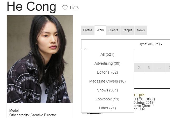 在MDC展现出来的工作履历中,贺聪表现不错:除了364场大秀之外,广告有39个、杂志封面16次、杂志内页62次。