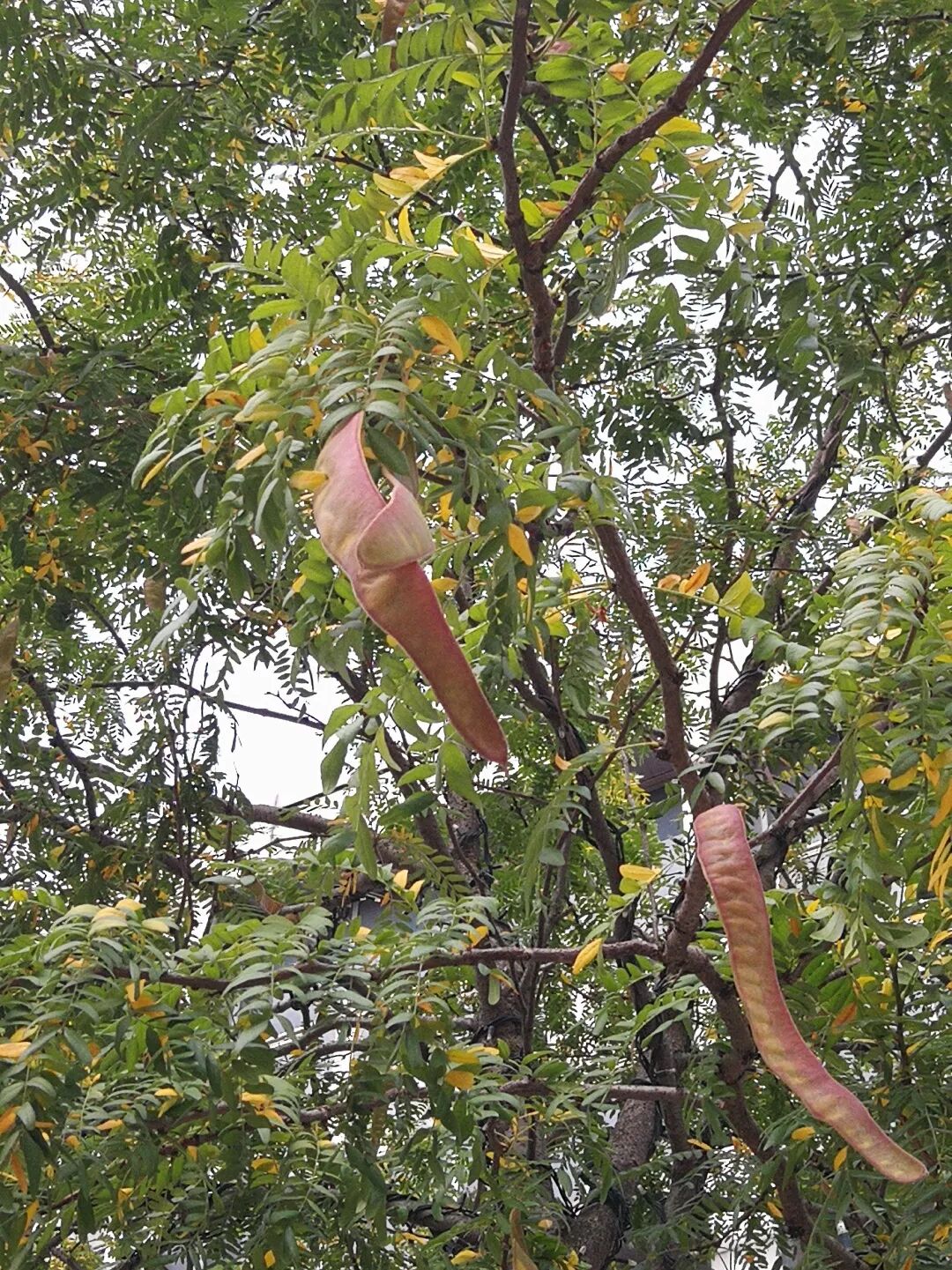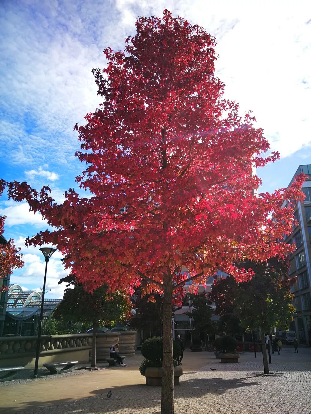 你是否记得,今年秋天见到的第一片变色的树叶是什么颜色?9月1日我在Peace Gardens广场前见到今年第一批正在转红的秋叶——这是一株北美枫香,它花了一个月的时间,终于在十月初换上了一身火红色的秋装。另一处公园Devonshire Green的广场上,八棵无刺美国皂荚的树叶正在悄悄变黄,9月末已是满树金黄,长长的果荚在成熟后掉落地面。无刺美国皂荚,9月7日叶片开始转黄,9月21日叶片全黄荚果掉落。图片:江南蝶衣