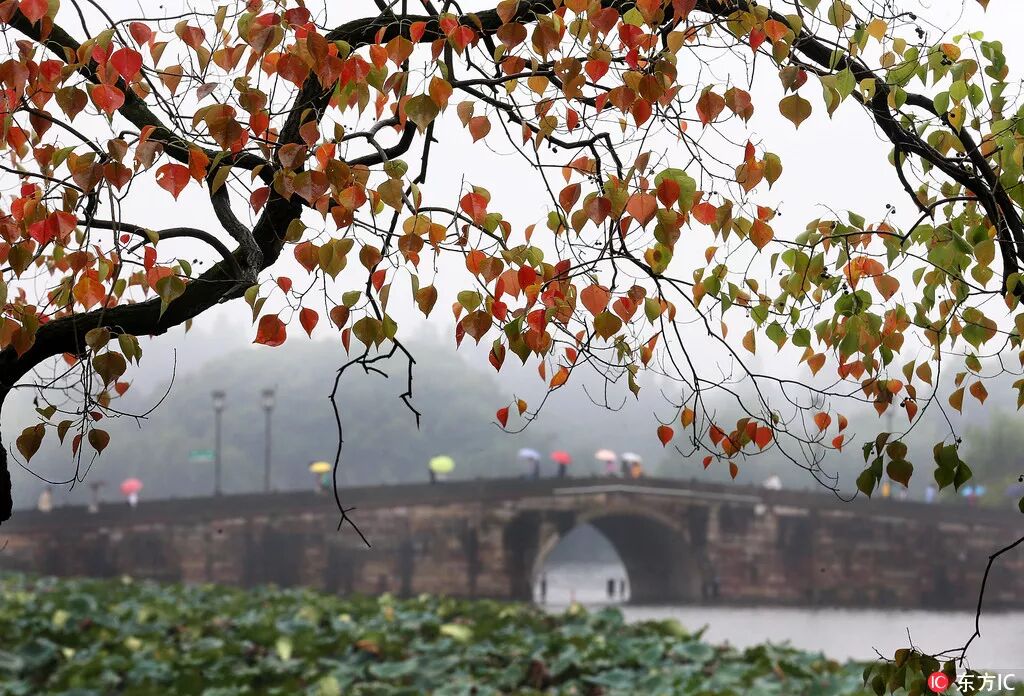 在华夏民族千百年的生产实践中,古人通过自然现象,观候知节。他们将一年分为二十四气、七十二候,又归纳出相应的动物、植物和自然规律来反映季节变化,称之为“候应”。然而节气本源自中国的黄河流域,是指导当地农事活动的历法,并不能适用于全国各个地区。杭州西湖秋色清新宜人,池塘显现残荷,游客漫步雨中,是江南韵味的秋景。图片署名:浙报集团 / 东方IC