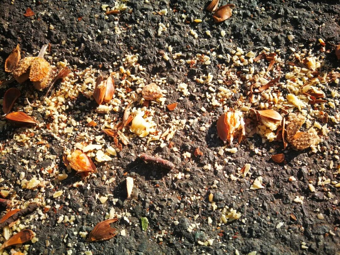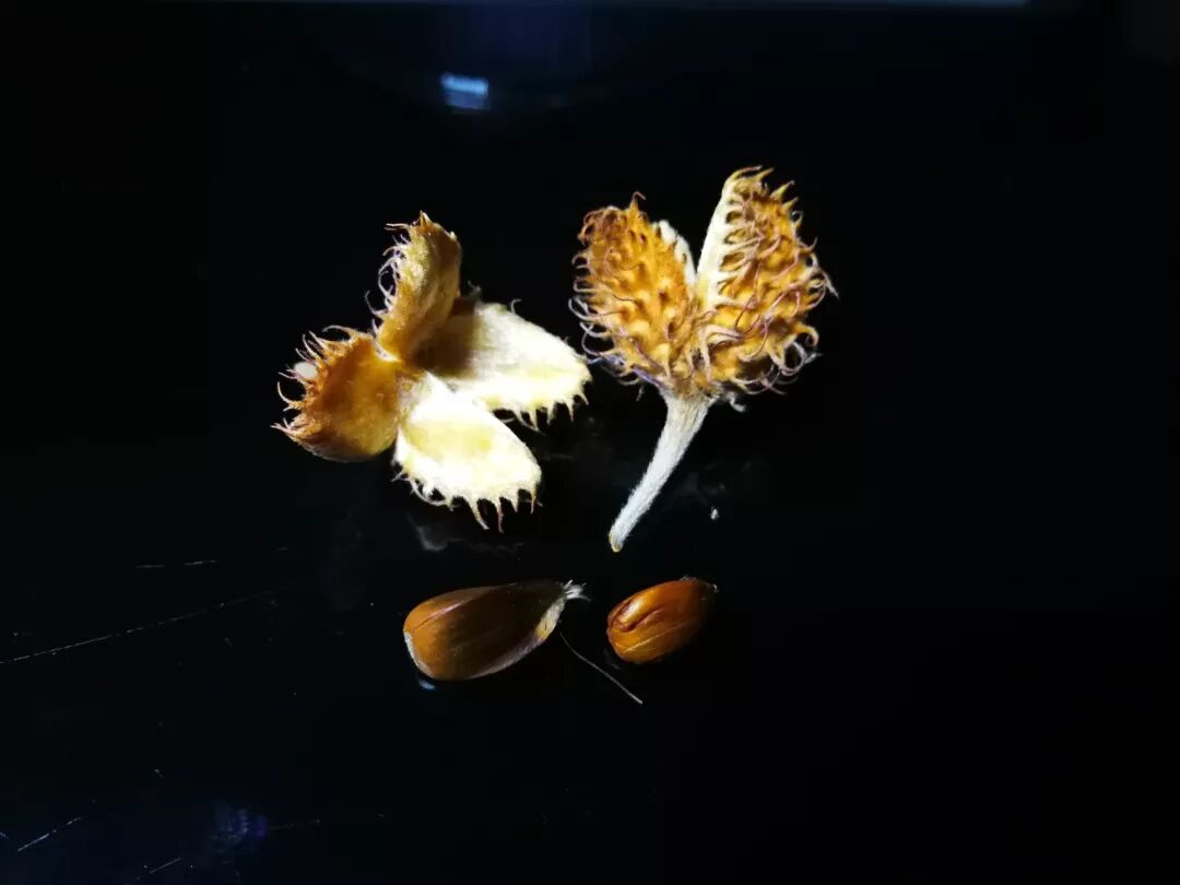 在我每个工作日必经之路,有一个长满欧洲水青冈(又名欧洲山毛榉,英国人叫它beech tree)的山坡,当地人称这条山路为 Beech Hill Rd。这些欧洲水青冈并不急着脱掉所有的黄叶,它会在枝头保留一些叶片给来年的新芽做掩护。每年8月,它的果实开始掉落,9月下旬树下掉落的果实最多。它的壳斗布满灰白色的粗毛,成熟开裂后,会露出里面两粒三棱形的坚果。据说在食物匮乏的年代,欧洲人也食用欧洲水青冈的种子,但由于含有大量鞣酸,尝起来非常苦涩(不要学我乱吃东西哦)。如今,因为有了人们的投食,就连经常路过的灰松鼠都对这遍地的种子不屑一顾。谢菲尔德植物园的欧洲水青冈,由于行人往来频繁,掉落的坚果被踩成粉末。图片:江南蝶衣