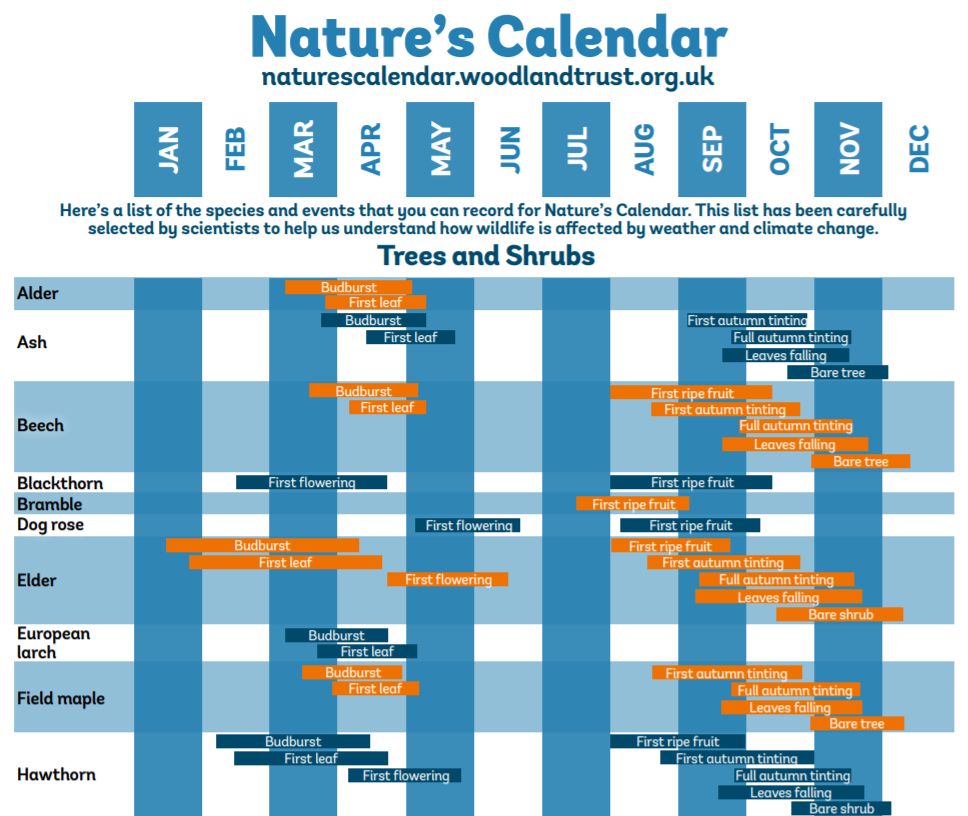 虽然英国没有总结出节气这类农事补充历法,但从1736年起,英格兰东部诺福克郡的罗伯特·马香,开始记录他庄园里动植物的生活周期:银莲花绽放、橡树发芽和秃鼻乌鸦开始筑巢的时间等等。这项观测传承了五代人,一直记录到1940年,成为了欧洲年代最长的物候记录。如今,欧洲物候观测网(EPN)、英国物候观测网(UKPN)以及一些公益组织,通过收集全国各地志愿者们提供的庞大物候数据,来帮助科学家们监测气候变化,研究气候变暖对环境带来的影响。根据英国各地志愿者向英国物候观测网提供的数据,制作发布的物候日历(局部)。图片:naturescalendar