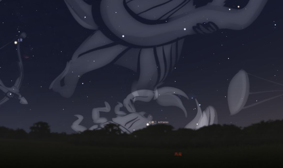 十月初,夜观星空,你会发现时序交替之间斗转星移,原本在盛夏、初秋的南方星空中耀眼的红色“大火星”,此刻正逐渐西沉没入地平线以下——冬天的脚步不远了。10月8日20时,大火星(位于天蝎座的心宿二)即将沉入西南方地平线。图片:借助Stellarium软件模拟