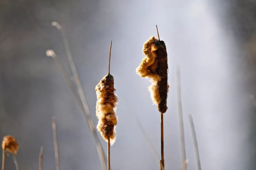 “炸裂”举个常见例子——香蒲属的果实(俗称“蒲棒”)。蒲棒看起来胖乎乎的,挺可爱,还可以作为插花材料。但放在房间里,有可能突然有一天就破裂了,飞出许多“白毛”。此外萝藦和鹅绒藤属的果实,放置久了也难免会裂开。