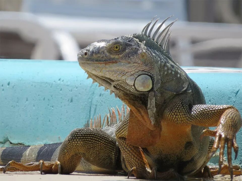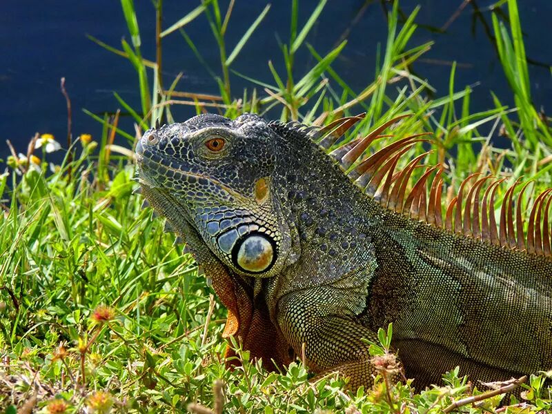 绿鬣蜥(Iguana iguana)就是其中之一。绿鬣蜥成体可以长到1.5米,长着一条皮鞭一样的尾巴和锐利的脚爪,雄性夸张的下颚肌肉更让它显得威武霸气。但不要被它的外表所吓到,绿鬣蜥实际上是个温和的素食主义者。