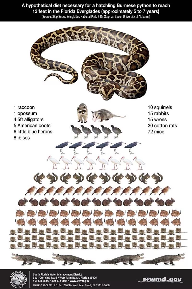 科学家假设的一条缅甸蟒长至约4米,所需摄取的食物总量。图片:South Florida Water Management District