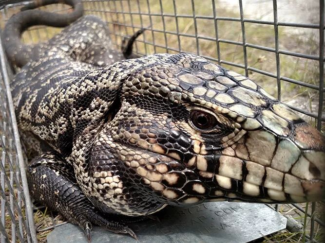 而相比被降温搞得措手不及的绿鬣蜥,下面这位就要淡定的多。原产于南美洲中东部地区的黑白泰加巨蜥(Salvator merianae)是一另种在佛州南部较为常见的大型蜥蜴,体长与成年绿鬣蜥接近。它和大熊猫一样,黑白配色,主要以捕食其它小型动物为食 ,而且专干偷蛋的勾当。科研人员已经多次在野外记录到它破坏美洲短吻鳄巢穴,以及挖掘取食龟蛋的行为。