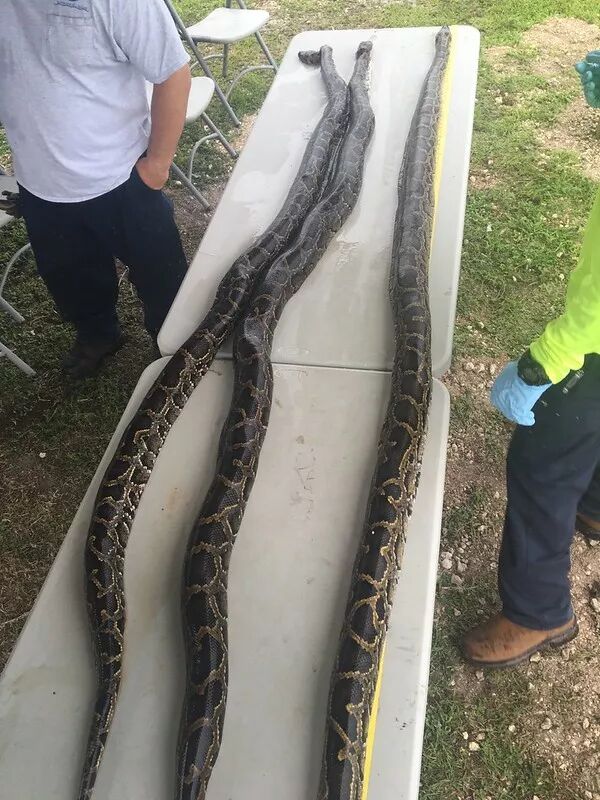 佛州的诸多入侵物种里,最出名的当属来自于亚洲的缅甸蟒(Python bivittatus)。缅甸蟒是世界上最大的蛇之一,成体体长可以达到5米,体重超过120公斤。