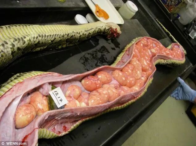 在被捕获的缅甸蟒腹中发现了59枚蛇卵。图片:Wenn.com
