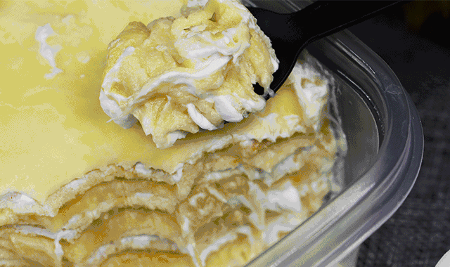 把新鲜金枕头果肉捣成果泥,涂抹在薄而多层的千层上。一层榴莲肉,一层奶油,一层班戟皮,一勺子舀下去,看着颤巍巍溢出来的榴莲肉,就有种浓浓的满足感和幸福感。