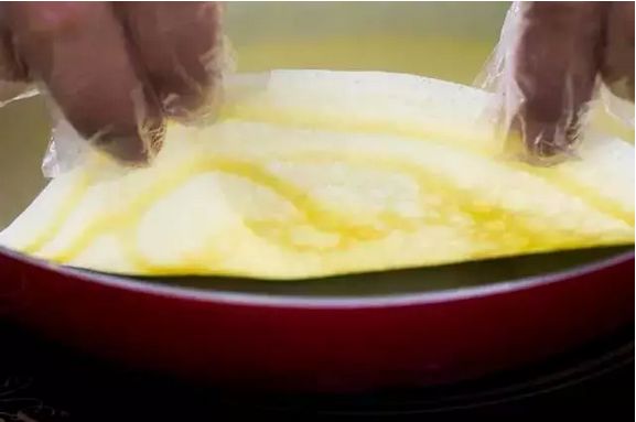 千层皮的制作过程也是十分讲究:温度控制在400℃,40s内烙成,每张饼皮约22g,误差不超过3g。正是因为如此,做出来的千层皮才能薄透与弹韧兼得,为软糯的榴莲和绵密的奶油带来层次丰富的口感。