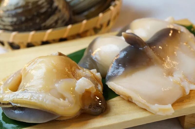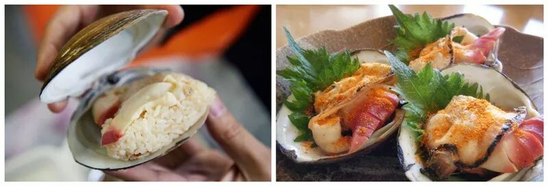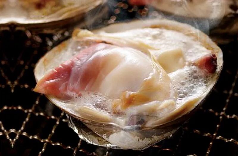 除了刺身,北寄貝有时也会烹熟食用,加热后的贝肉由浅灰色变为浅红色,质地变韧,入口更显爽脆。最常见的就是“北寄貝貝焼”,以贝壳作为盛具,置于炭火之上烤得鲜香四溢;除此以外,北寄貝还可以做味噌汤、炊饭或鍋物等等。
