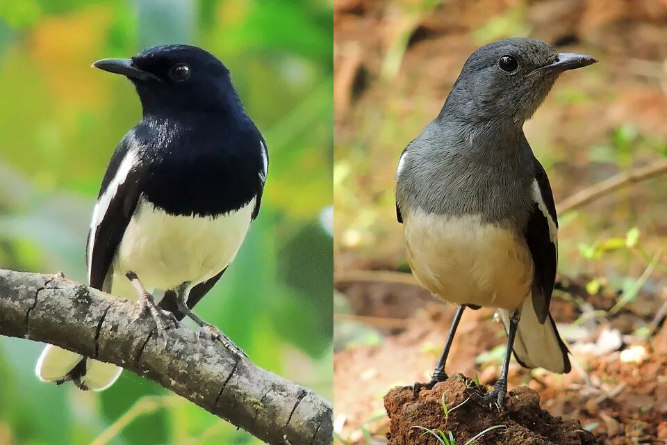 鹊鸲,左雄右雌。图片:Shantanu Kuveskar / wikimedia