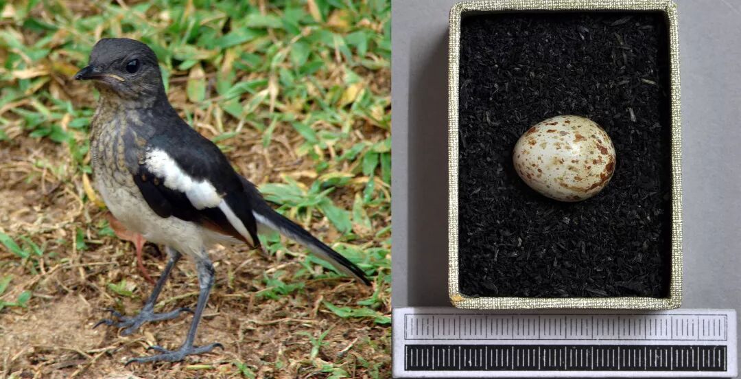 鹊鸲亚成鸟与鸟蛋。图片:Hafiz Issadeen / flickr;Klaus Rassinger / wikimedia