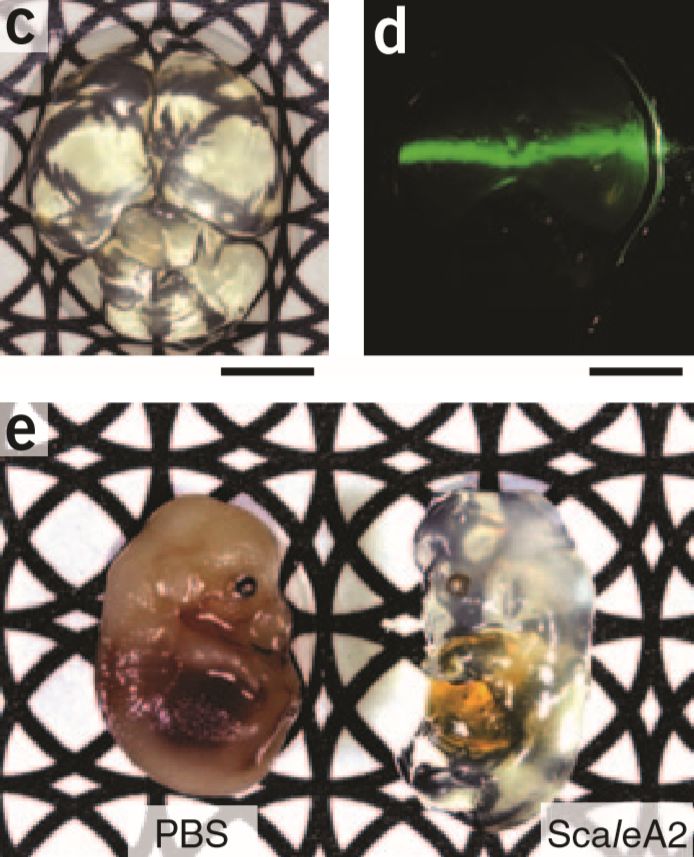 人类对于透明的向往由来已久,无论是魔法世界还是科幻电影都曾塑造过透明人,然而实现起来却没有那么容易。2011年,日本科学家研制了一种神奇药水,被其浸泡过的小鼠大脑可以变成透明的。科学家利用这种药水,可以观察到几厘米深处的神经细胞网络,进一步提高人类对大脑细胞网络连接的认识。小鼠大脑经过处理变透明,激光照射观察(上);胚胎经过试剂处理后变透明(下)。图片:Hama H, et al. / Nature neuroscience(2011)