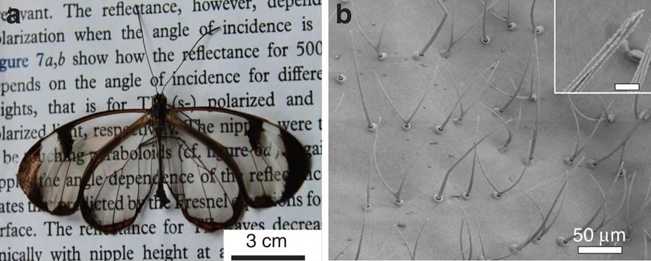 在某些特定情况下,叶形幼体甚至能将身体扁平化至1毫米厚度,有一种超越极限的感觉。然而把自己压扁这种狠手段,我们人类好像不太能达到啊。毕竟二维化可是《三体:死神永生》中二向箔的杀伤性效果,还是算了吧。宽纹黑脉绡蝶使自己的翅膀变透明的方法,就没有那么简单粗暴了。研究人员发现,宽纹黑脉绡蝶翅膀的透明区域覆盖着一层细长的微毛,它们排列疏松、长短不一。宽纹黑脉绡蝶的透明翅膀。图片:Siddique R H, et al. / Nature communications(2015)
