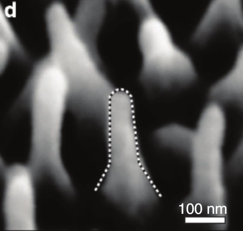 而在微毛之间的区域则随机分布着如下图所示的纳米柱,它们恰恰就是宽纹黑脉绡蝶透明的秘密所在。这些不起眼的纳米柱突起充当了折射率媒介的重要角色。在纳米柱顶部,折射率与外界环境一致;在底部,表现为有机体本身的折射率;在中间区域,折射率就在这两者的区间范围内缓慢变化。这种超结构既不散射光,又能使反射光低至2%~5%,从而成就了透明的翅膀。宽纹黑脉绡蝶透明翅膀上的纳米柱(nanopillars)。图片:Siddique R H, et al. / Nature communications(2015)