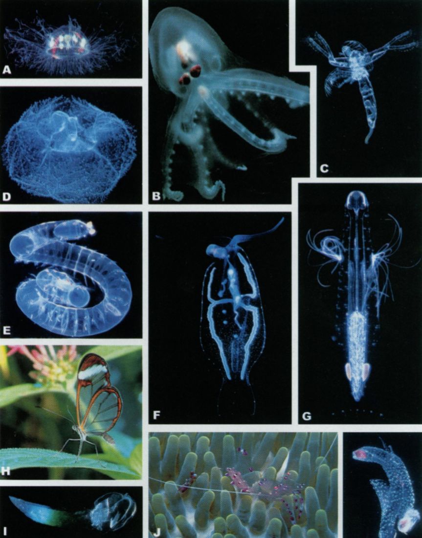广阔的海洋中有一些生物,就算你用视力5.2的眼睛努力分辨,也未必看得到它们。因为它们是透明的。提到透明的海洋生物,很多人第一时间会想到水母,当然也可能会想到凉拌海蜇皮。其实透明的海洋生物种类多样,小到深海鱼类的幼体,大到章鱼,种类可谓繁多。透明生物种类繁多。图片:Johnsen S / The Biological Bulletin(2001)