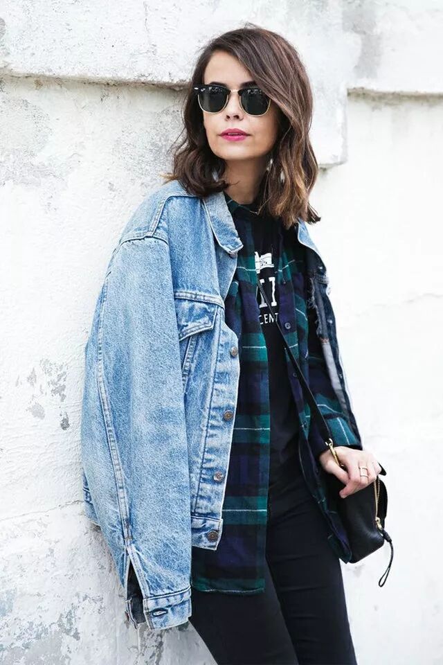 牛仔外套也可以让穿起来显得中规中矩程序员格子衫焕发新生,可以选择有一点点oversized的外套进行搭配,增强时髦感。