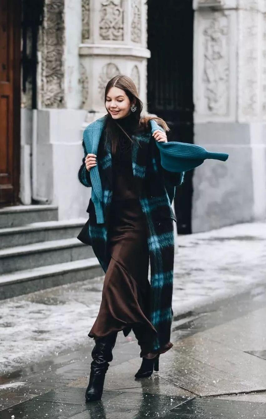 像上图这样把长过膝盖的风衣和及长裙搭配在一起,对一般人来说穿着效果比较死亡,如果换一件短的风衣,会看起来比例好很多。